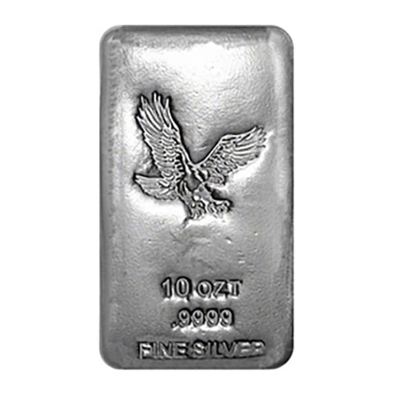 Advantages of the 10 oz Silver Bar Eagle includes: (1) because of the bar’s uniform weight and size customers can easily track value by following the daily buy/sell prices. (2) The Bar is handy for smaller transactions providing a wider investor audience. And this size is easily stored in bank deposit boxes. (3) The price paid over “spot” is small because the bars are bullion. (4) The Bar is an ideal form of barter in case paper currency is questioned.