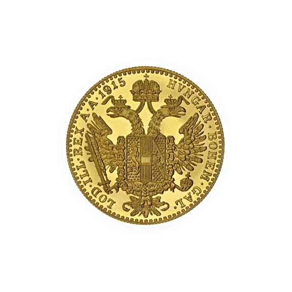 The front of the Austrian 1 Ducat Gold Coin which features the likeness of Franz Joseph I who was born in 1848, and died in 1916. The reverse depicts the House of Habsburg’s coat of arms. The Habsburgs occupied the Holy Roman Empire throne from 1438 – 1740. They produced kings of Bohemia, England, Germany, Hungary, Croatia, Ireland, Portugal, Spain Dutch and Italian countries.