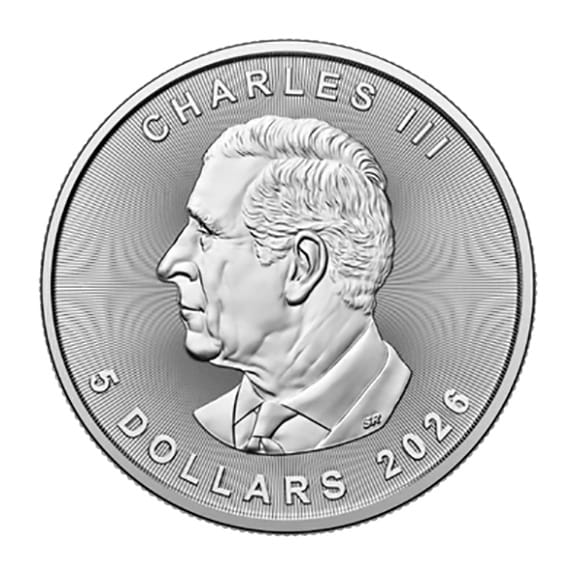 The front of the coin features King Charles III and includes its legal tender value ($5 Canadian). The Canadian Silver Maple Leaf 1 oz 2026 is a pure silver coin and the date changes each year. The reverse features a stylized maple leaf; the Canadian national symbol because the maple tree grows in all 10 provinces. It also includes the coin’s weight and purity.